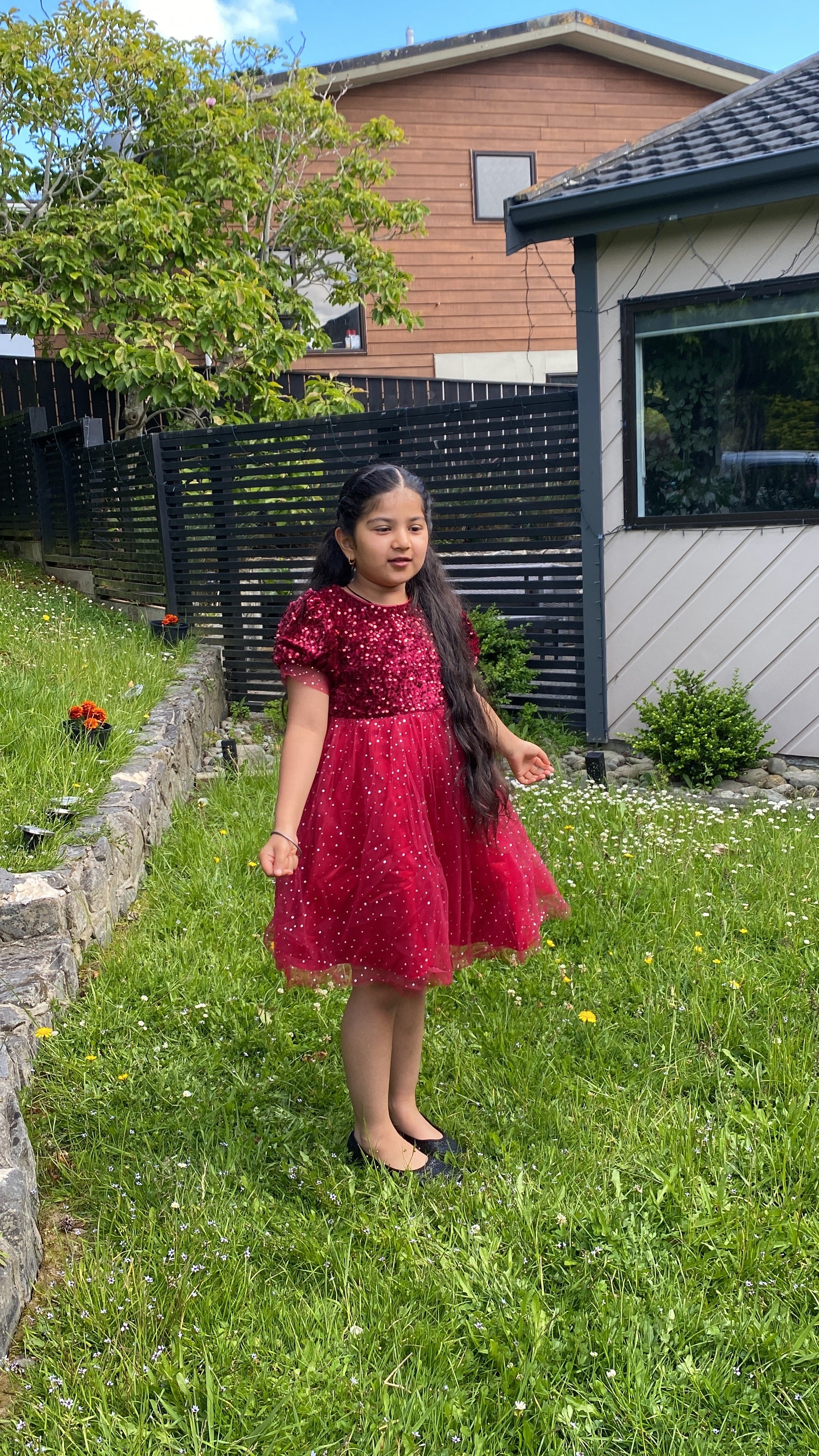 "Celebrate the holiday season with this stunning Christmas Sequin Dress, crafted with a soft cotton lining for comfort and a shimmering polyester outer layer. Featuring intricate beading and impeccable craftsmanship, this dress is perfect for festive occasions. Available for pre-order in sizes 2 to 10 years."